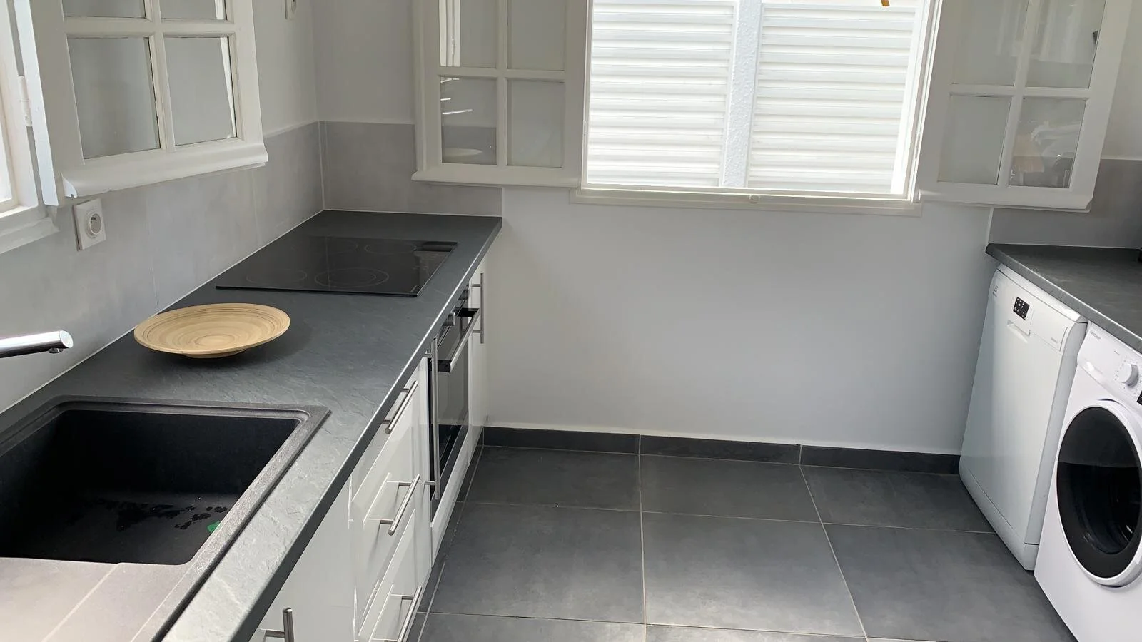 - Plaques 4 feux, réfrigérateur-congélateur, lave-vaisselle, four, four micro-ondes, Blender, cafetière à filtre, cafetière à capsules Nespresso, grille-pain, divers ustensiles de cuisine et jeu complet de vaisselle et couvert.