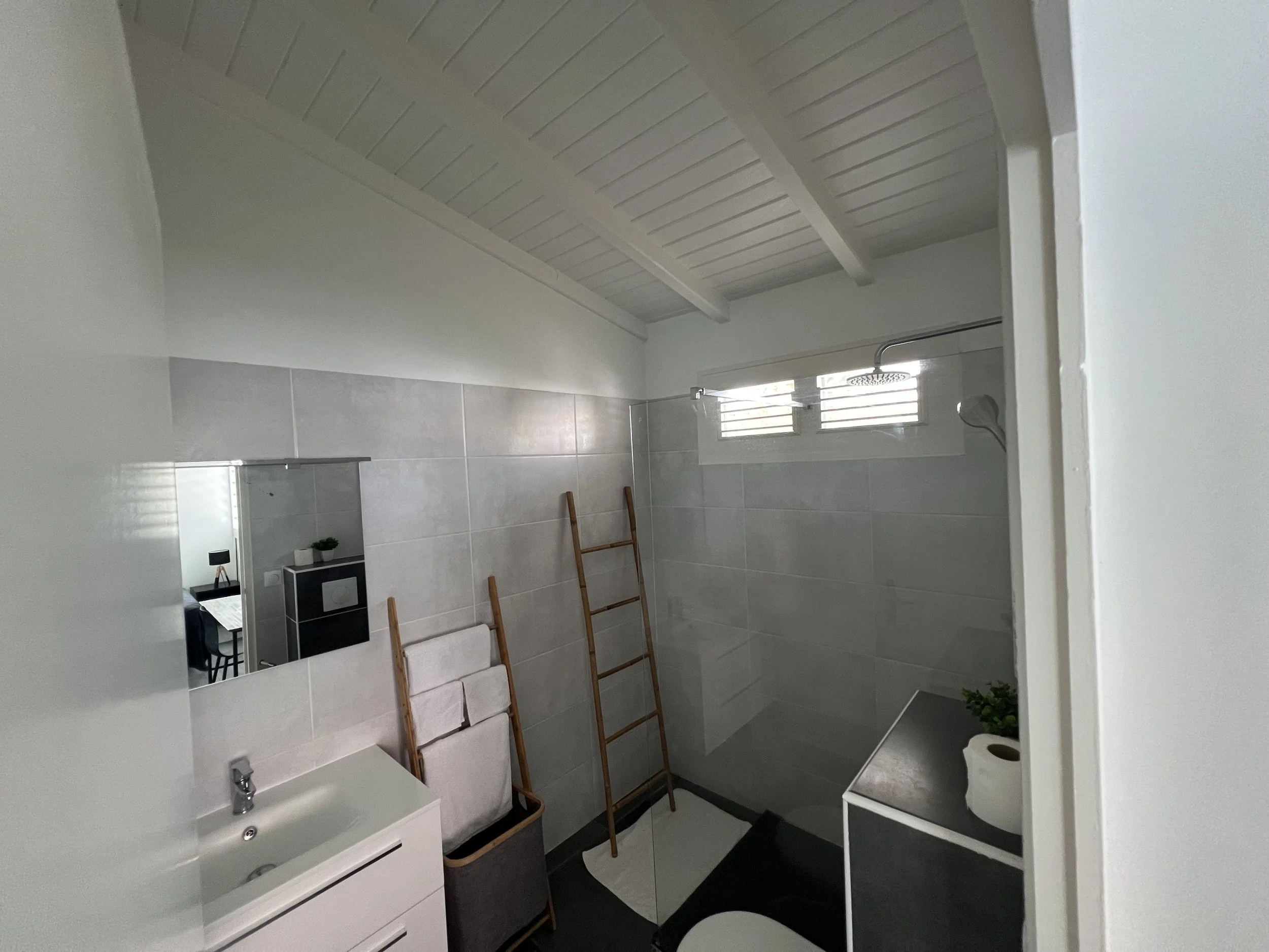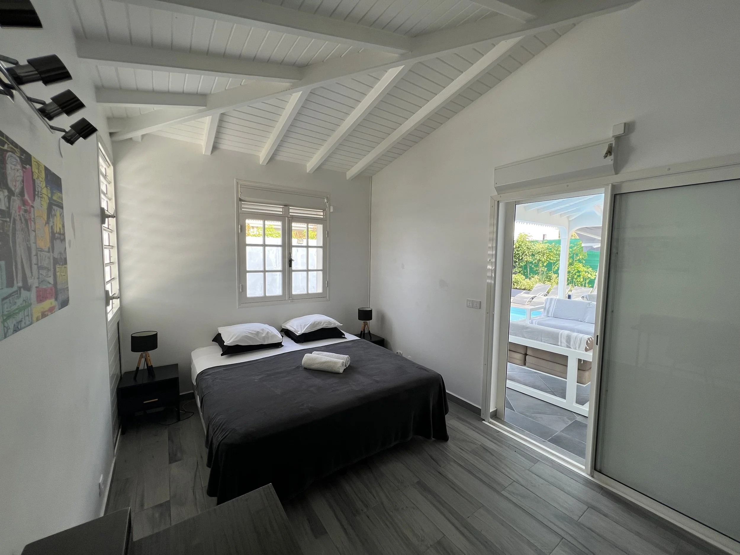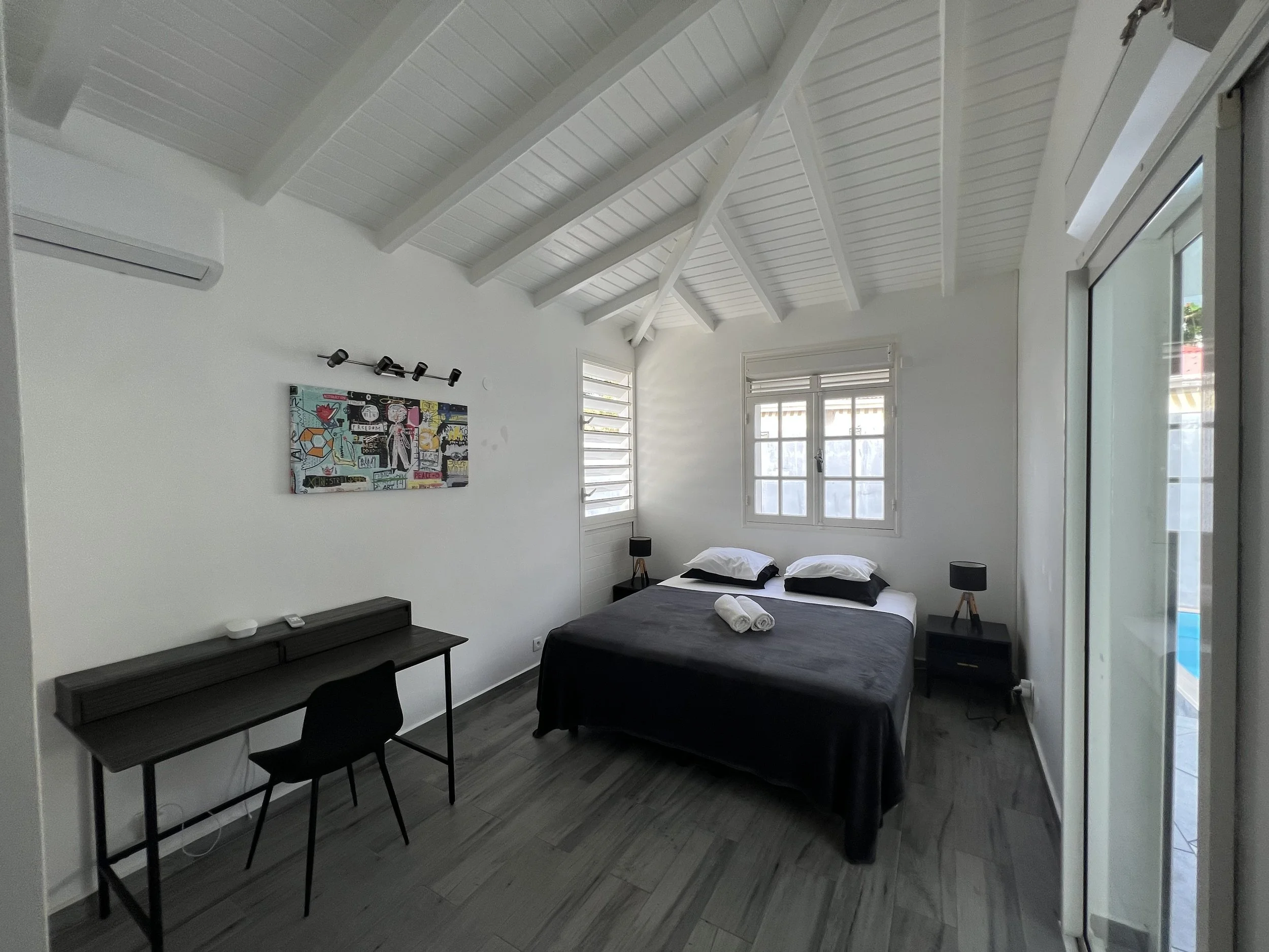 The master bedroom is an oasis of quietness and relaxation. The king size bed and private bathroom/toilet allow you to have your quiet, peaceful time in the house. The direct access to the pool allows you to jump from your bed to the pool. The room has a desk allowing you to work remotely if needed.